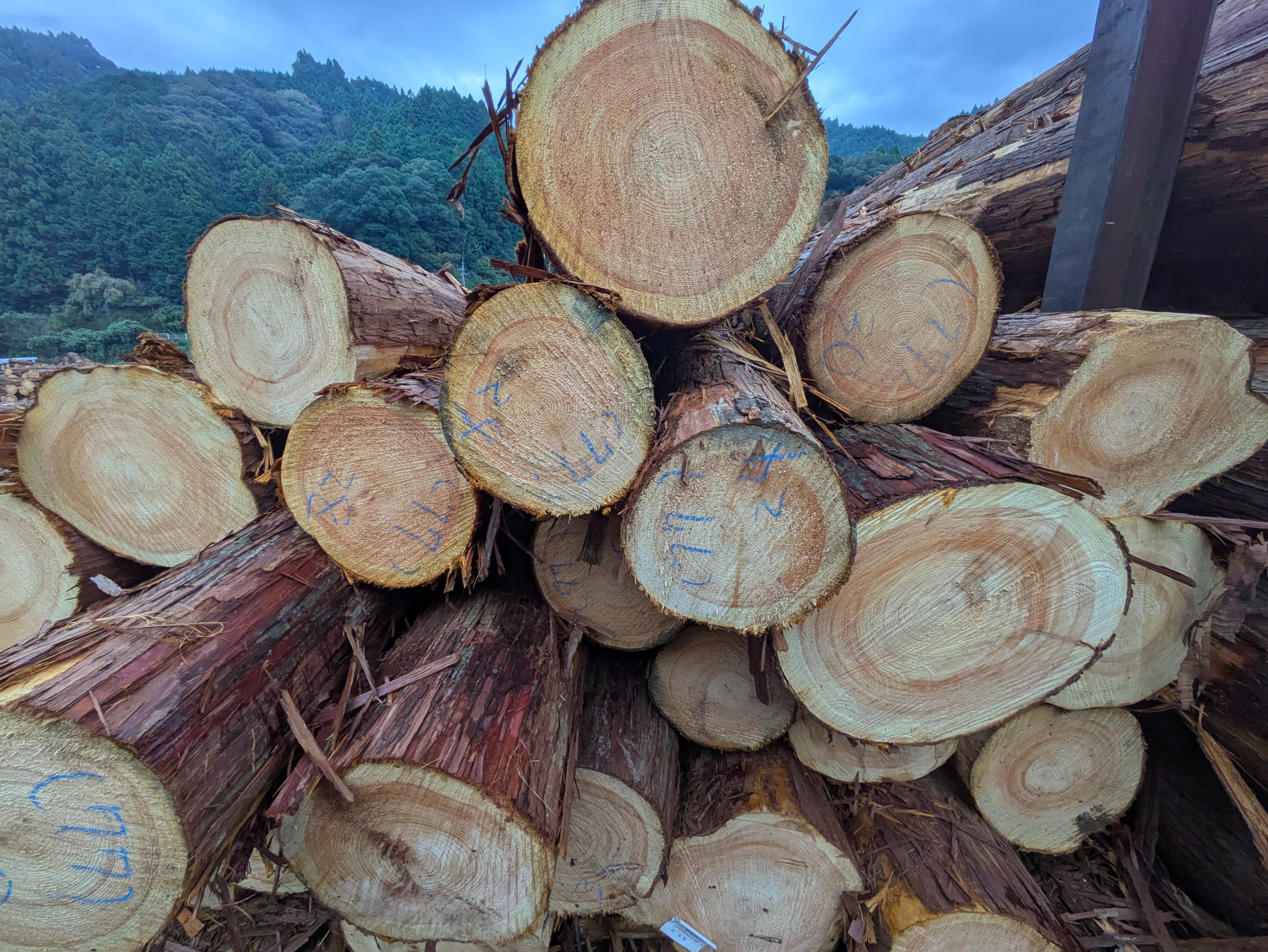 森に入る代わりに、私たちは学びを深めるため、香南市森林組合様のご厚意で木材ストックヤードを見学させていただきました。