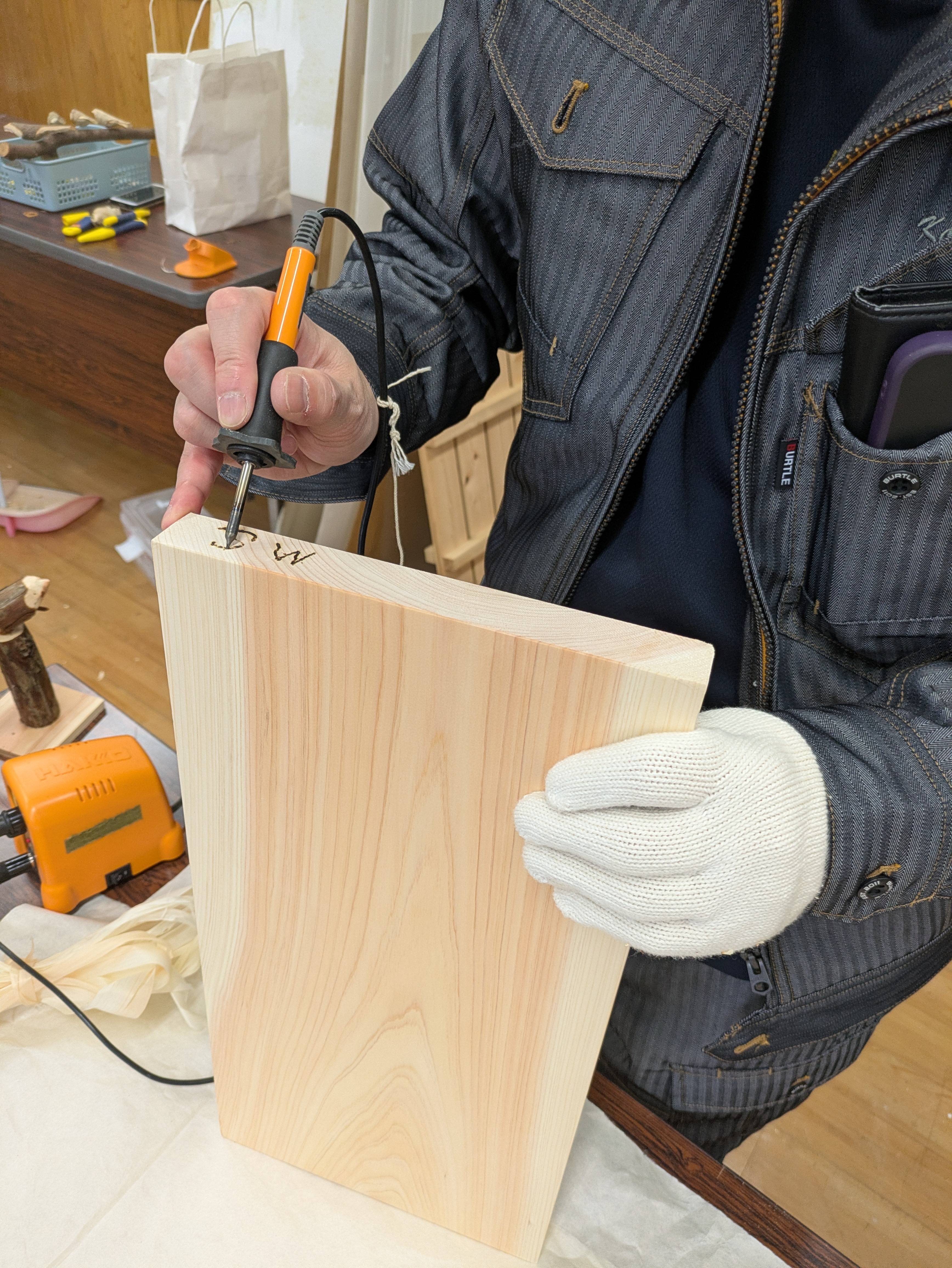 使用したのは、前回の活動(10月)で社員が実際に除伐したヒノキを乾燥させた木材です。自分たちが手入れした木が、時間と手をかけて乾燥され、まな板という暮らしに役立つ形に生まれ変わる過程を体験しました。