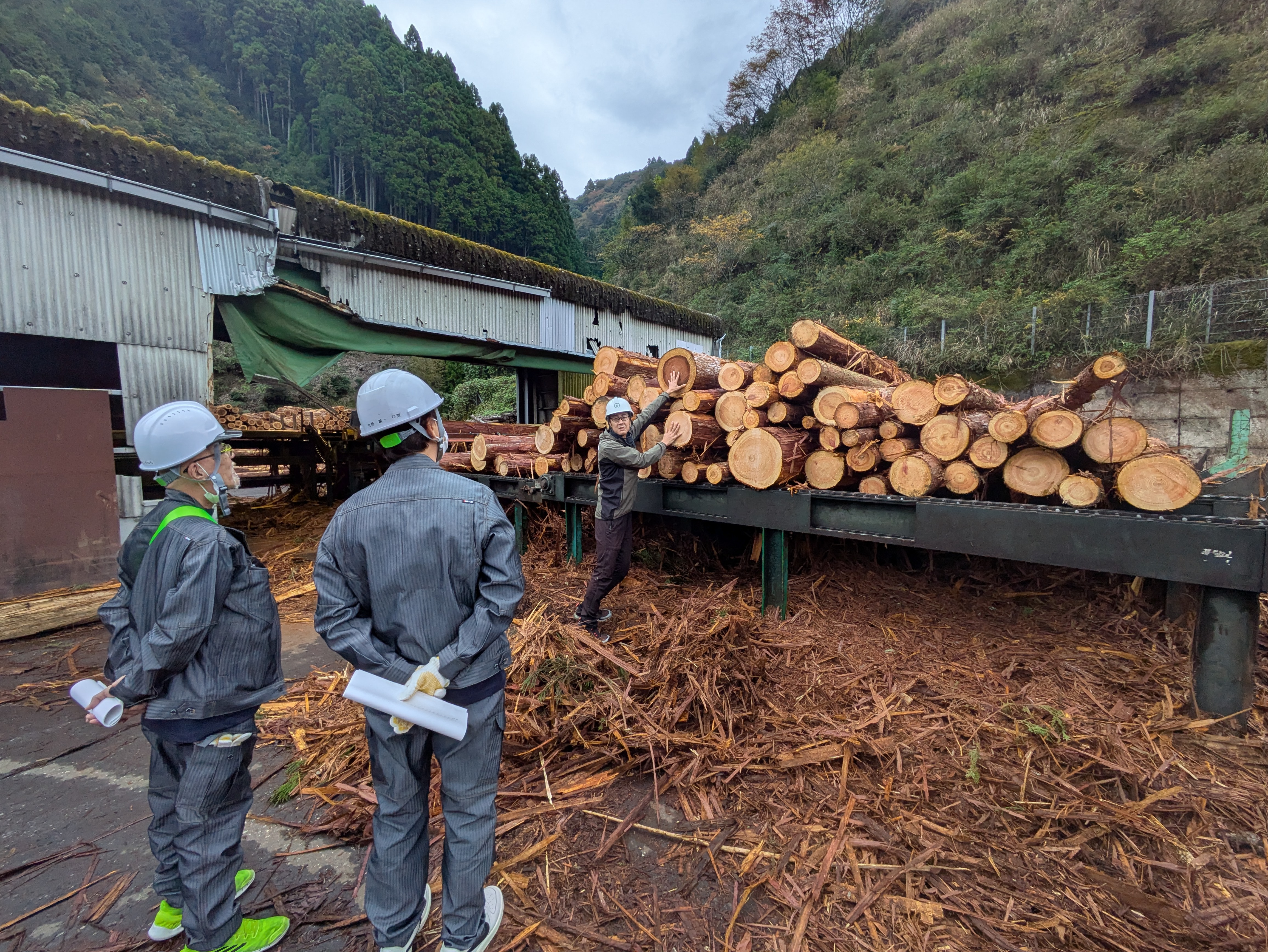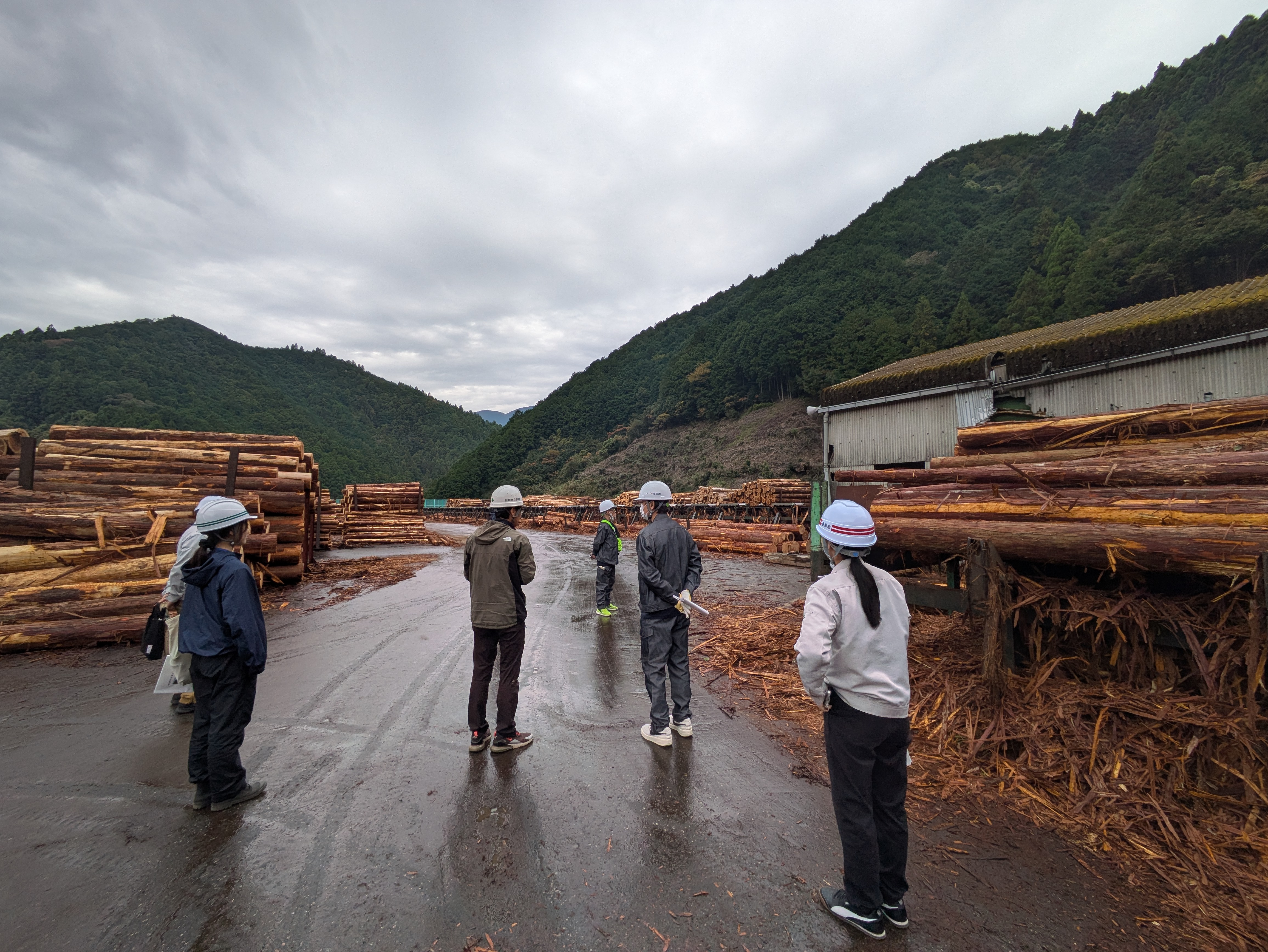 森に入る代わりに、私たちは学びを深めるため、香南市森林組合様のご厚意で木材ストックヤードを見学させていただきました。
