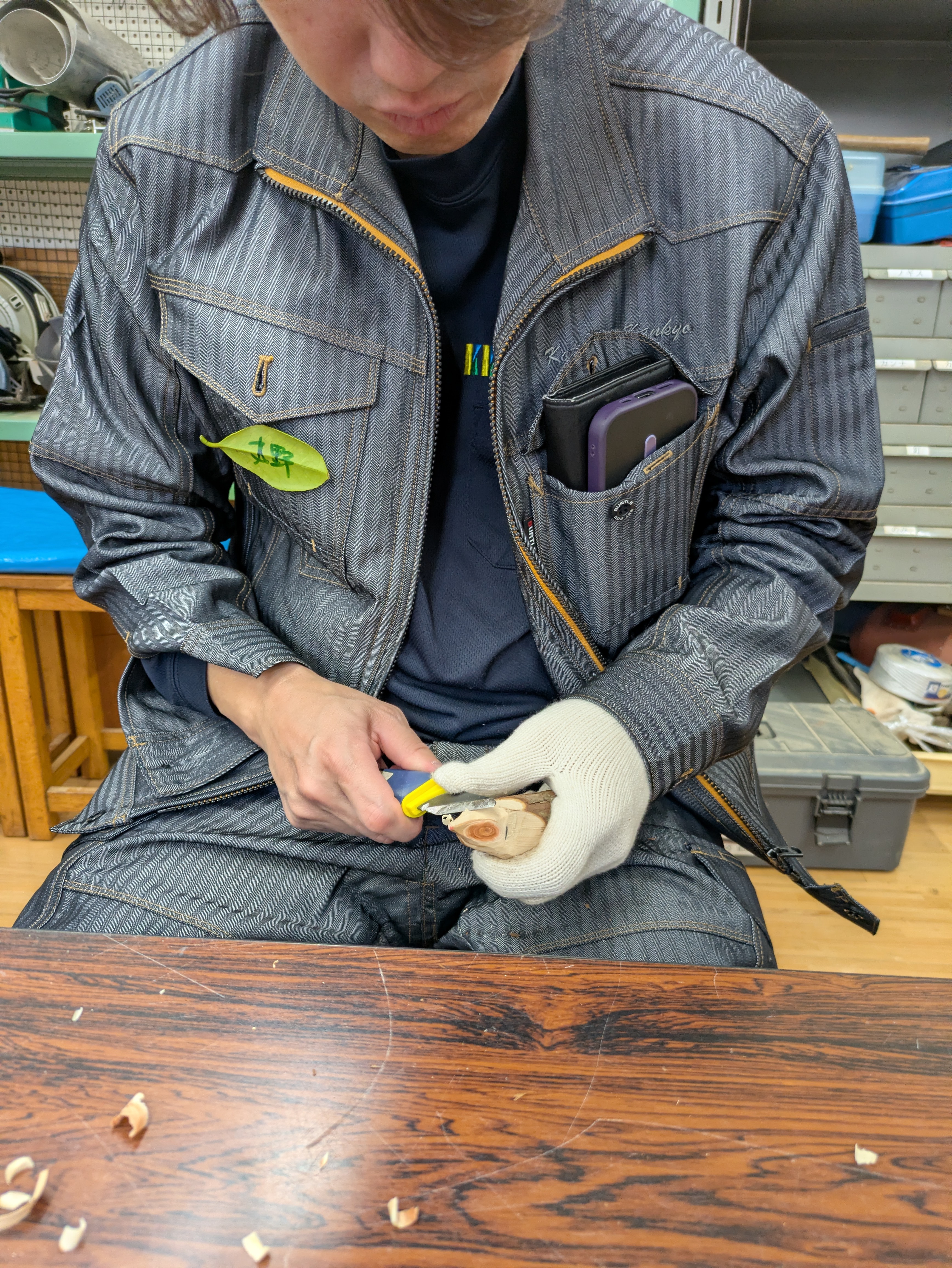 使用したのは、前回の活動(10月)で社員が実際に除伐したヒノキを乾燥させた木材です。自分たちが手入れした木が、時間と手をかけて乾燥され、まな板という暮らしに役立つ形に生まれ変わる過程を体験しました。